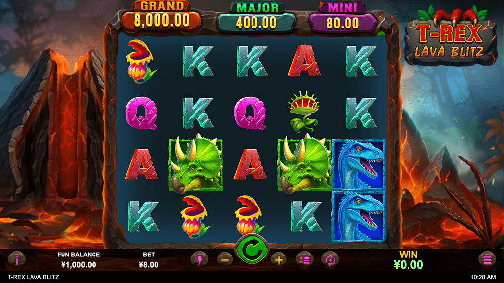 T-Rex: Lava Blitz GAME FEATURES Volatility: Medium Connected Ways: 178 Connecting Ways Free Spins Eligible?: Yes Top Award: 1,250 times the base bet Reels: 5 Volatility