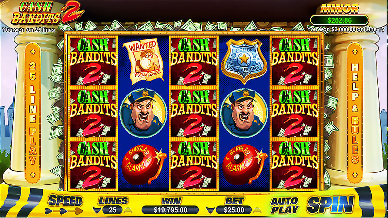 这款5x3,25线的中波动性老虎机游戏,充满狡诈的劫匪们在到处犯案!他们继续寻找着更金闪闪的目标! 玩家可以嬴取高达最高17赔倍和190局免费游戏。