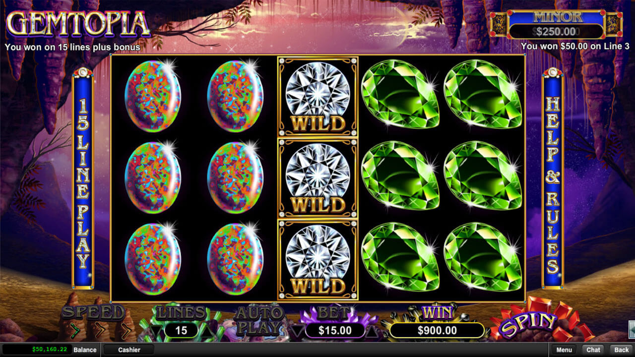 这款独特的5x3,15线的中波动性老虎机游戏有2个闪耀的特色游戏,一个'百搭符号重新旋转特色游戏'和一个'有奖励挑选的免费游戏'! 转轴上若出现一个扩散的百搭符号宝石,即触发一次重新旋转。 15个免费游戏旋转期间,会给予额外的'奖励'宝石至转轴上,若出现3个或更多的宝石,则额外给予免费游戏,且每颗宝石会给予最高1000倍投注额的立即奖金