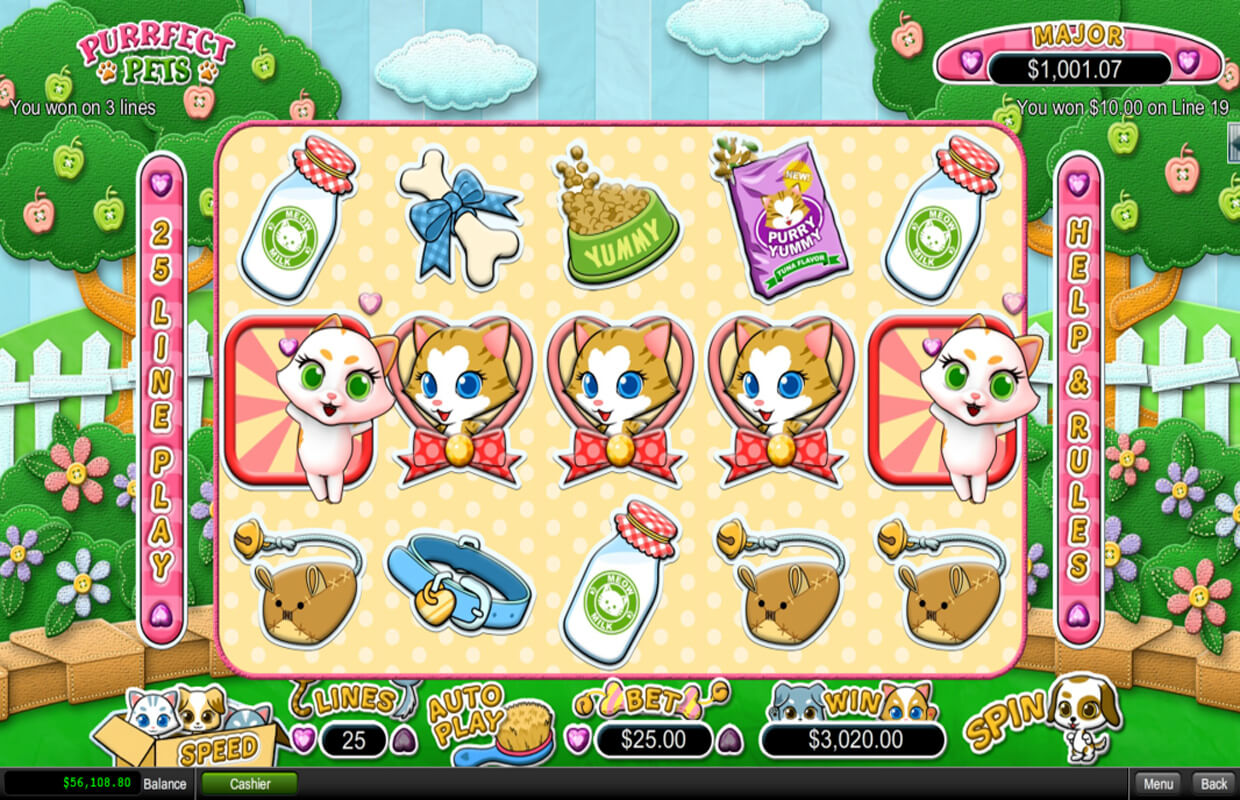 愛貓人士和愛狗人士會被此全新25線老虎機遊戲給迷倒.貓百搭符號會給予10局免費特色遊戲,且獎金變三倍.此老虎機遊戲包括有一個隨機的特色遊戲.